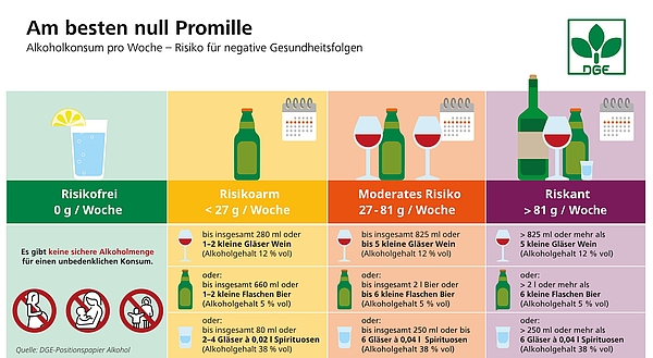 Die Deutsche Gesellschaft für Ernährung (DGE) empfiehlt auf ihrer Webseite, möglichst ganz auf Alkohol zu verzichten.